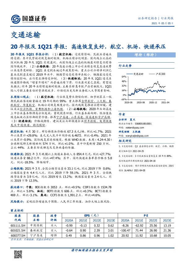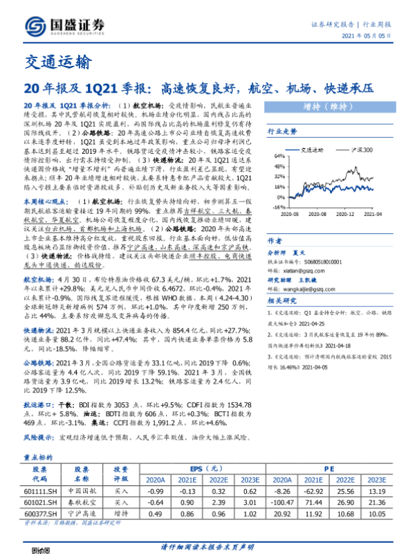 【国盛证券】【20210505】交通运输20年报及1Q21季报:高速恢复良好,航空、机场、快递承压-17页