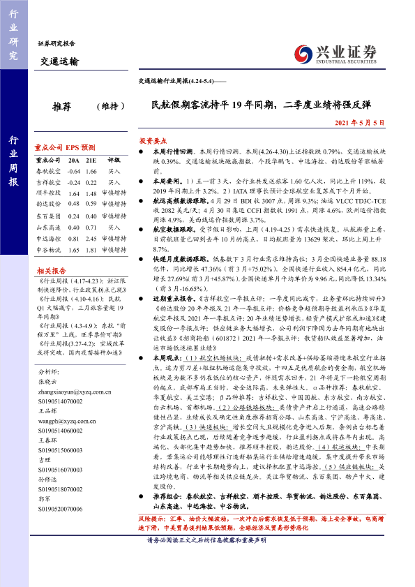 【兴业证券】【20210505】交通运输行业周报:民航假期客流持平19年同期,二季度业绩将强反弹-21页