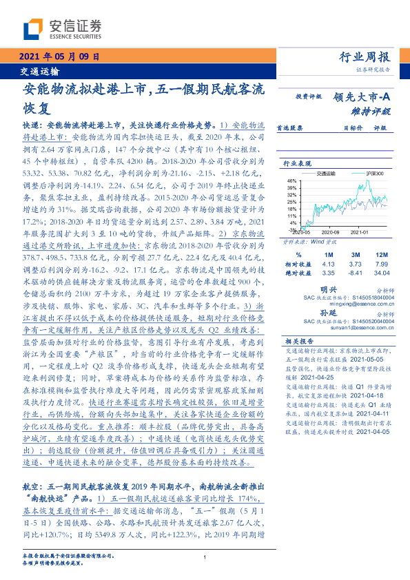 【安信证券】【20210509】交通运输行业周报:安能物流拟赴港上市,五一假期民航客流恢复-17页