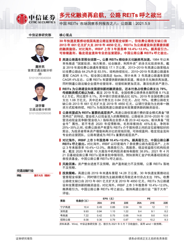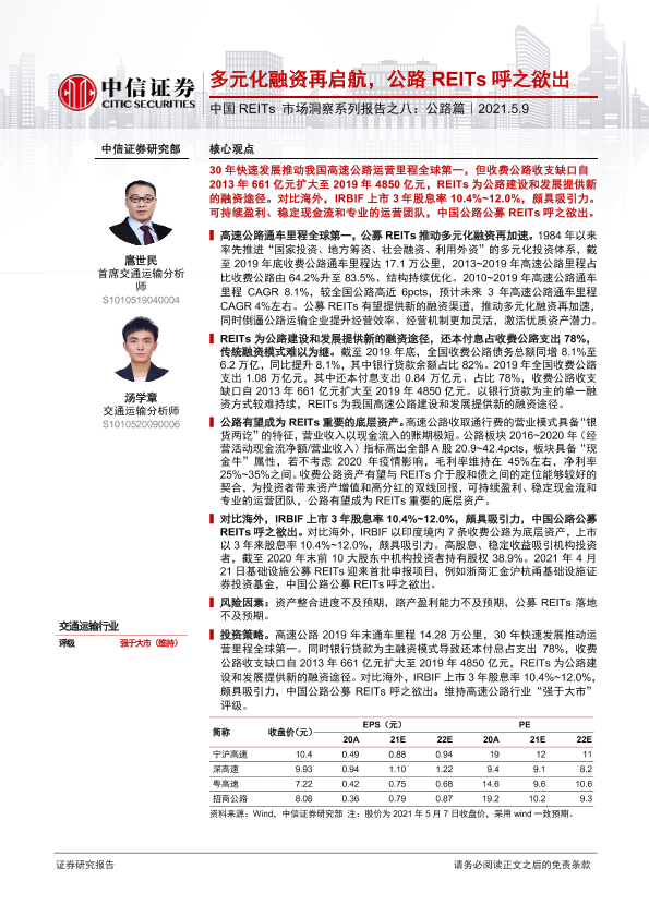 【中信证券】【20210509】中国REITs市场洞察系列报告之八:公路篇:多元化融资再启航,公路REITs呼之欲出-22页