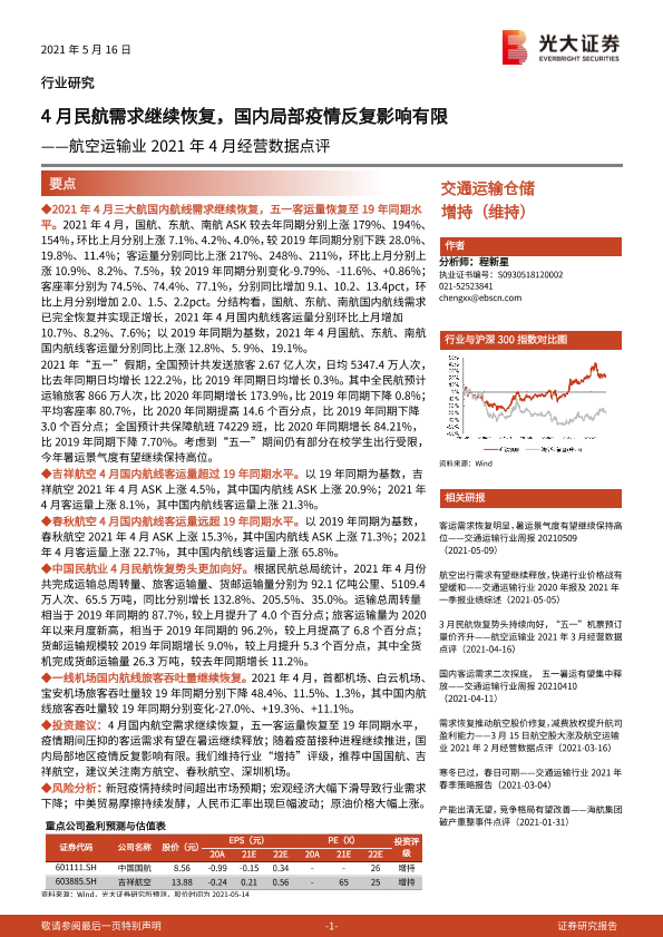 【光大证券】【20210516】航空运输业2021年4月经营数据点评-8页