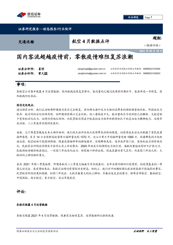 【国信证券】【20210516】航空4月数据点评:国内客流超越疫情前,零散疫情难阻复苏浪潮-8页