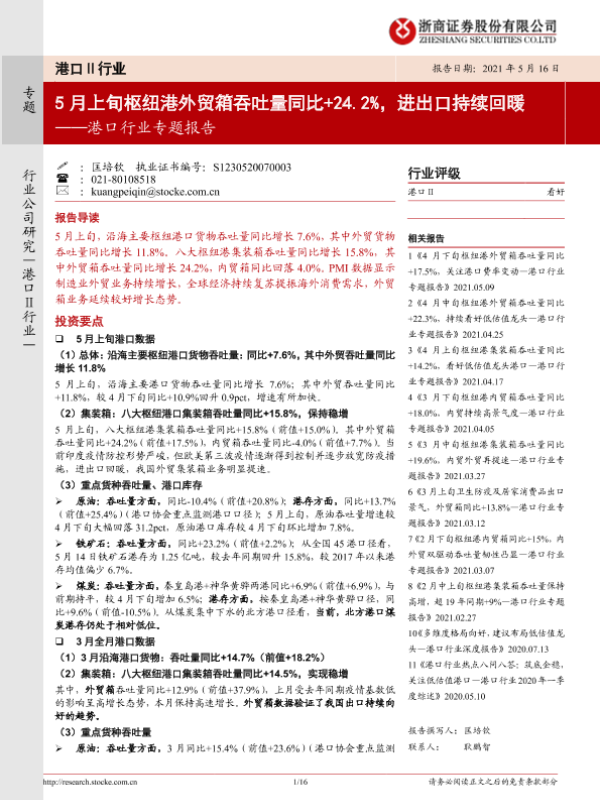 【浙商证券】【20210516】5月上旬枢纽港外贸箱吞吐量同比+24.2%,进出口持续回暖-16页