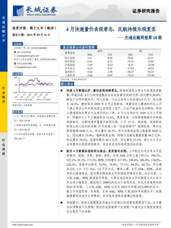 【长城证券】【20210516】4月快递量价表现常态,民航持续乐观复苏-22页
