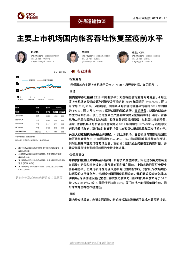 【中金公司】【20210517】主要上市机场国内旅客吞吐恢复至疫前水平-6页