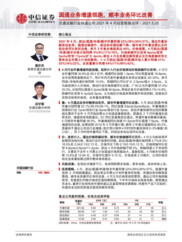 【中信证券】【20210520】交通运输行业快递公司2021年4月经营数据点评-2页