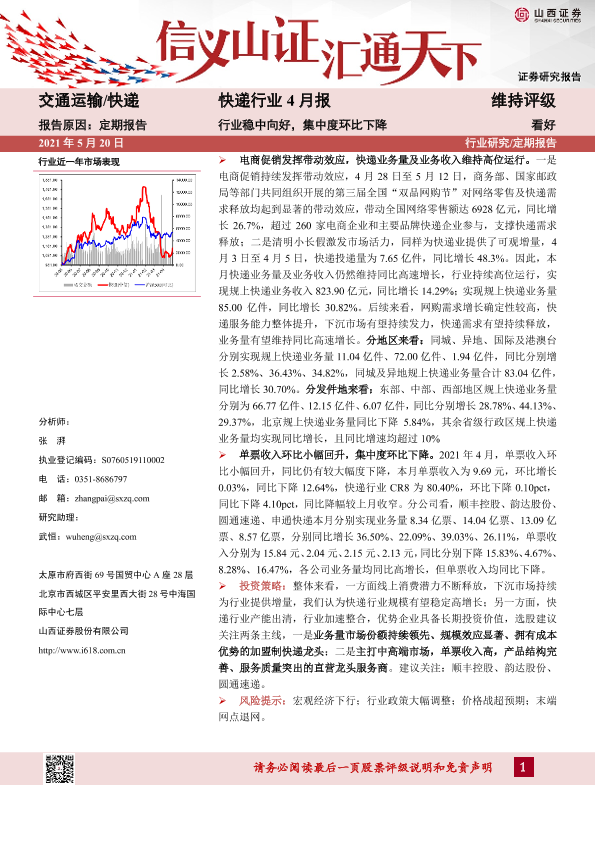 【山西证券】【20210520】快递行业4月报:行业稳中向好,集中度环比下降-13页