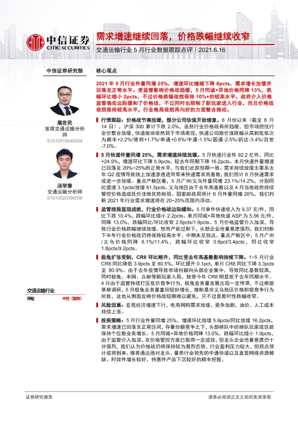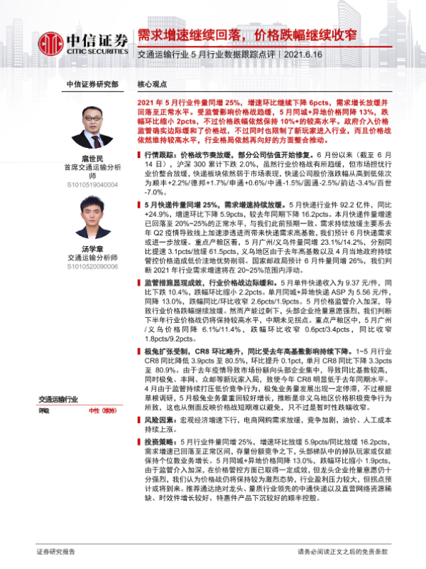 【中信证券】【20210616】交通运输行业5月行业数据跟踪点评-8页