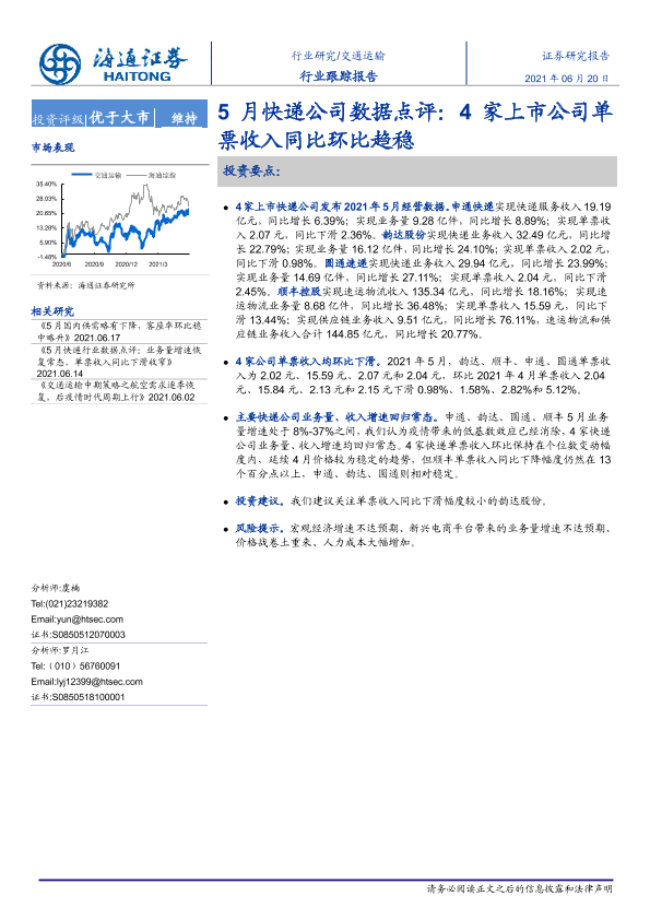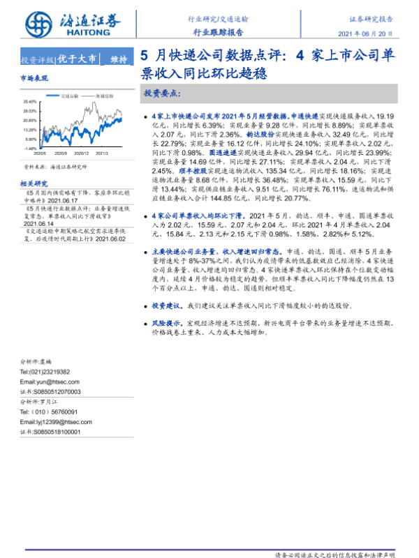 【海通证券】【20210620】5月快递公司数据点评:4家上市公司单票收入同比环比趋稳-3页