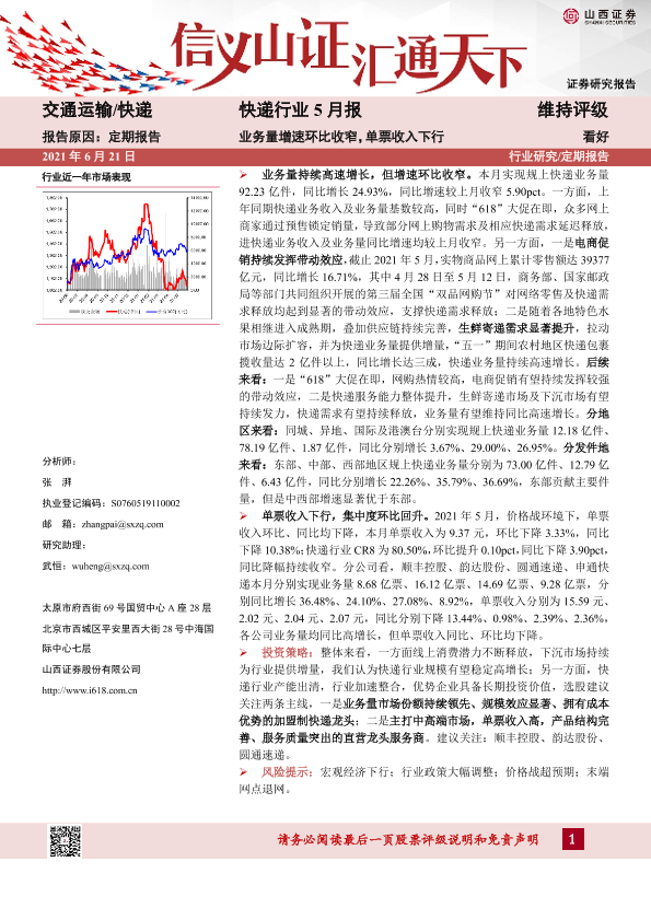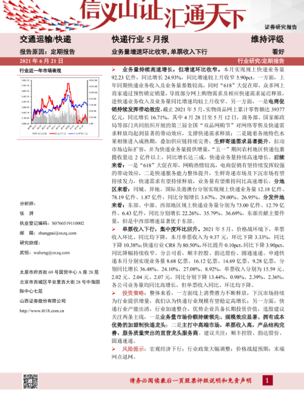 【山西证券】【20210621】快递行业5月报:业务量增速环比收窄,单票收入下行-13页
