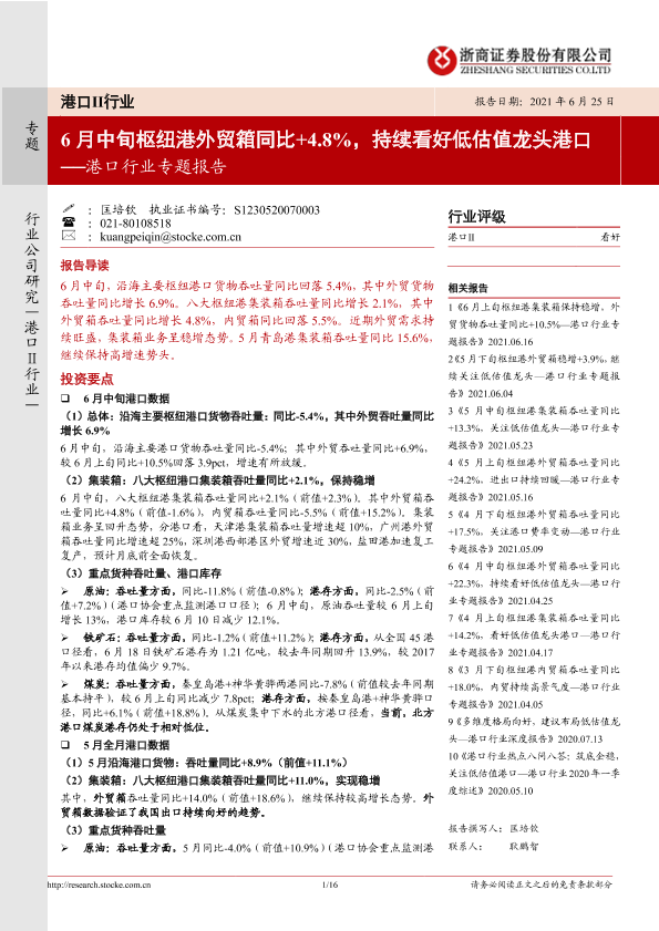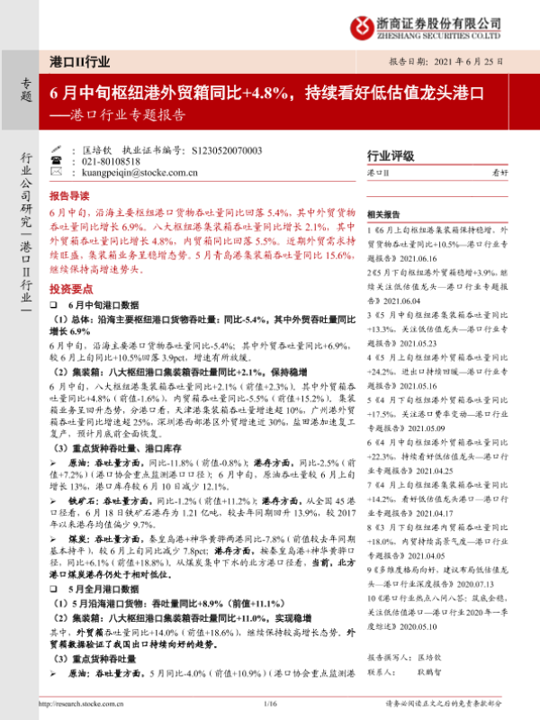 【浙商证券】【20210625】6月中旬枢纽港外贸箱同比+4.8%,持续看好低估值龙头港口-16页