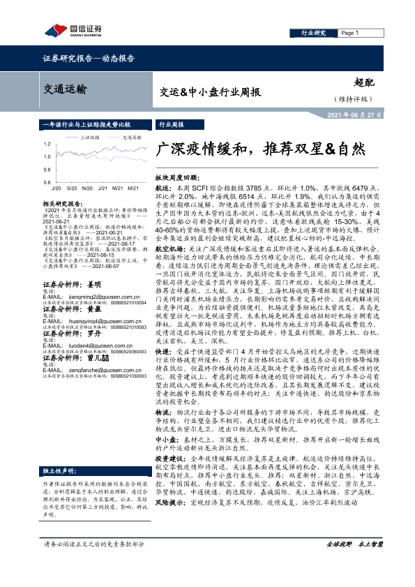 【国信证券】【20210627】交运&中小盘行业周报:广深疫情缓和,推荐双星&自然-20页