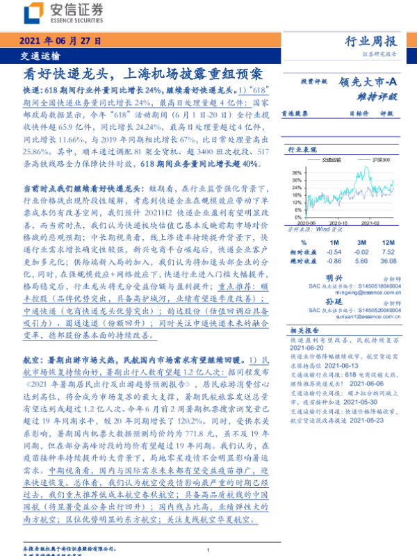 【安信证券】【20210627】交通运输行业周报:看好快递龙头,上海机场披露重组预案-17页