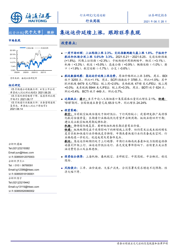 【海通证券】【20210628】交通运输行业周报:集运运价延续上涨,跟踪旺季表现-9页