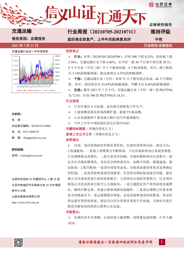【山西证券】【20210711】交通运输行业周报:盐田港全面复产,上半年民航恢复良好-14页