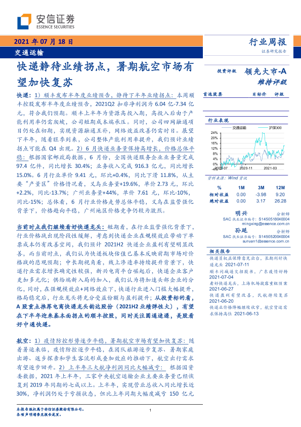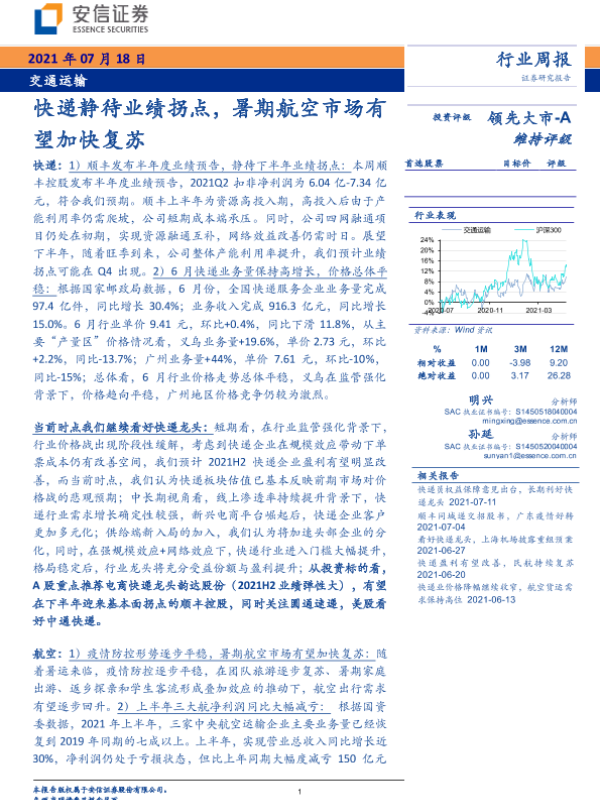 【安信证券】【20210718】交通运输行业周报:快递静待业绩拐点,暑期航空市场有望加快复苏-17页