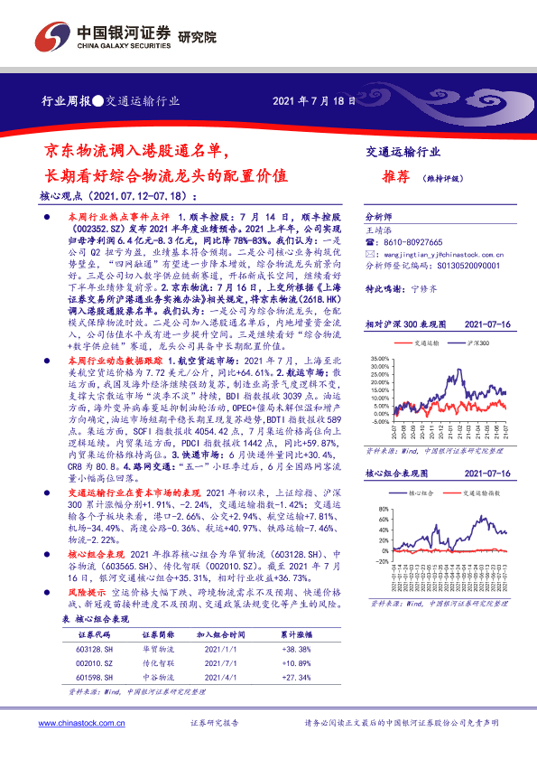【银河证券】【20210718】交通运输行业:京东物流调入港股通名单,长期看好综合物流龙头的配置价值-20页