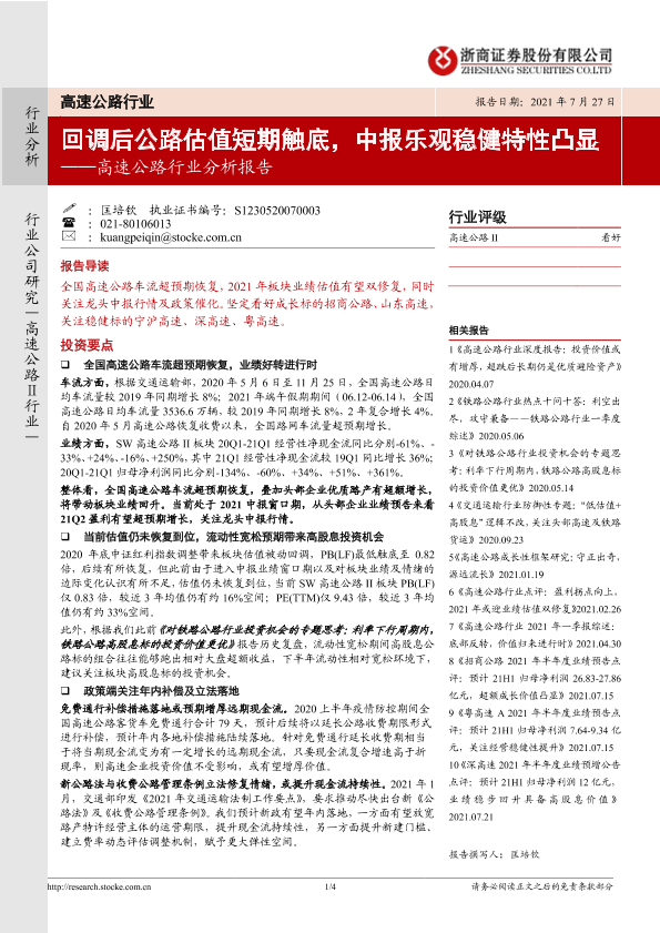 【浙商证券】【20210727】高速公路行业分析报告:回调后公路估值短期触底,中报乐观稳健特性凸显-4页