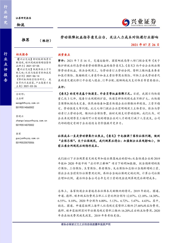 【兴业证券】【20210726】劳动保障权益指导意见出台,关注人力成本对快递行业影响-5页