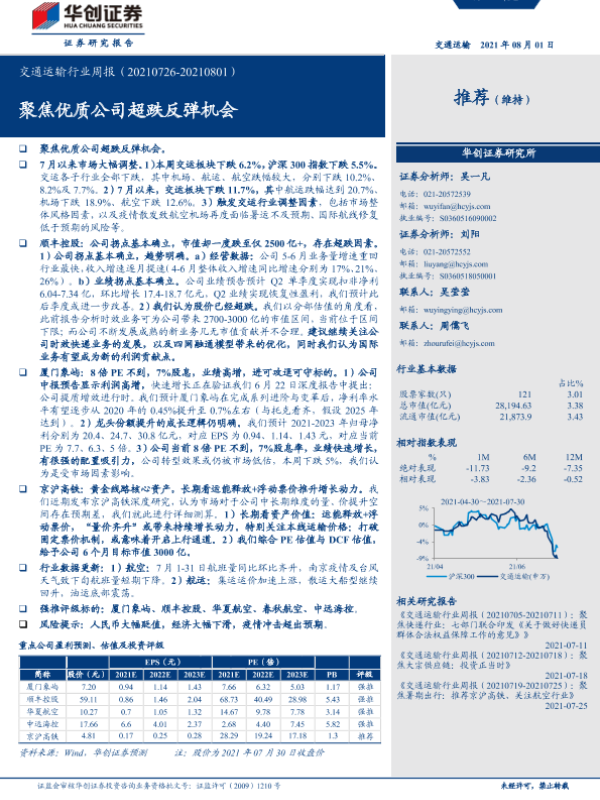 【华创证券】【20210801】交通运输行业周报:聚焦优质公司超跌反弹机会-20页