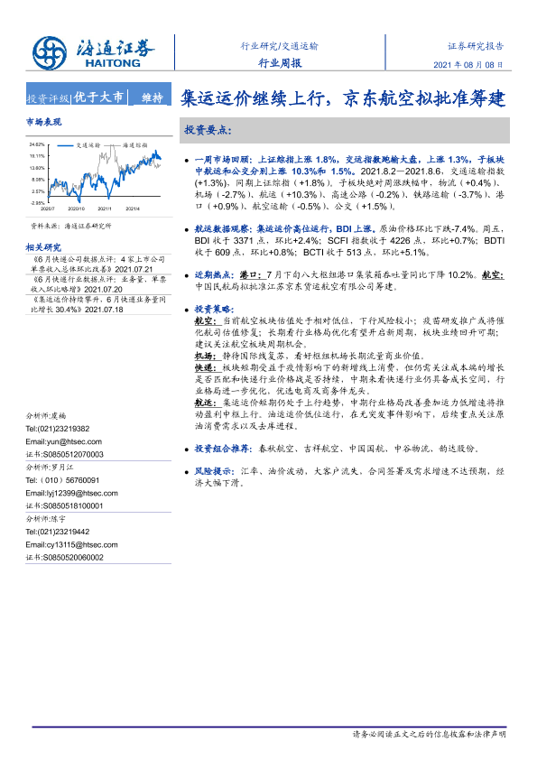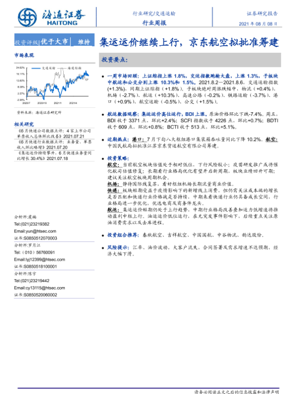 【海通证券】【20210808】交通运输行业周报:集运运价继续上行,京东航空拟批准筹建-8页