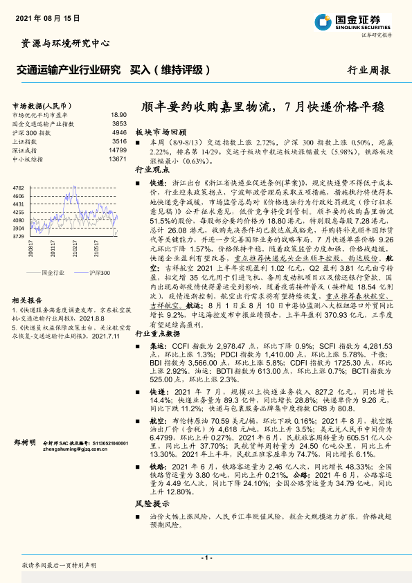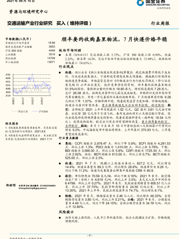 【国金证券】【20210815】交通运输行业周报:顺丰要约收购嘉里物流,7月快递价格平稳-14页