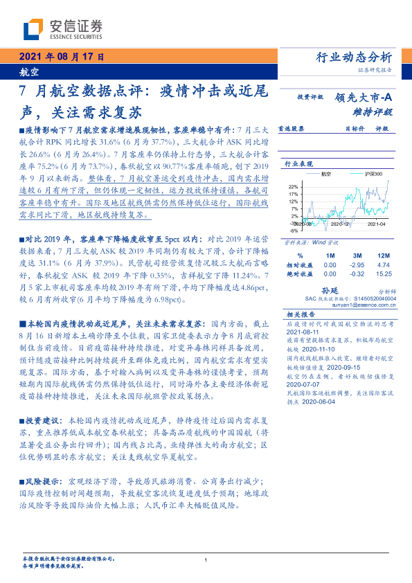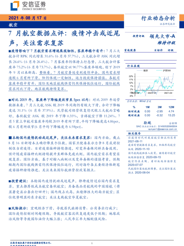 【安信证券】【20210817】7月航空数据点评:疫情冲击或近尾声,关注需求复苏-9页