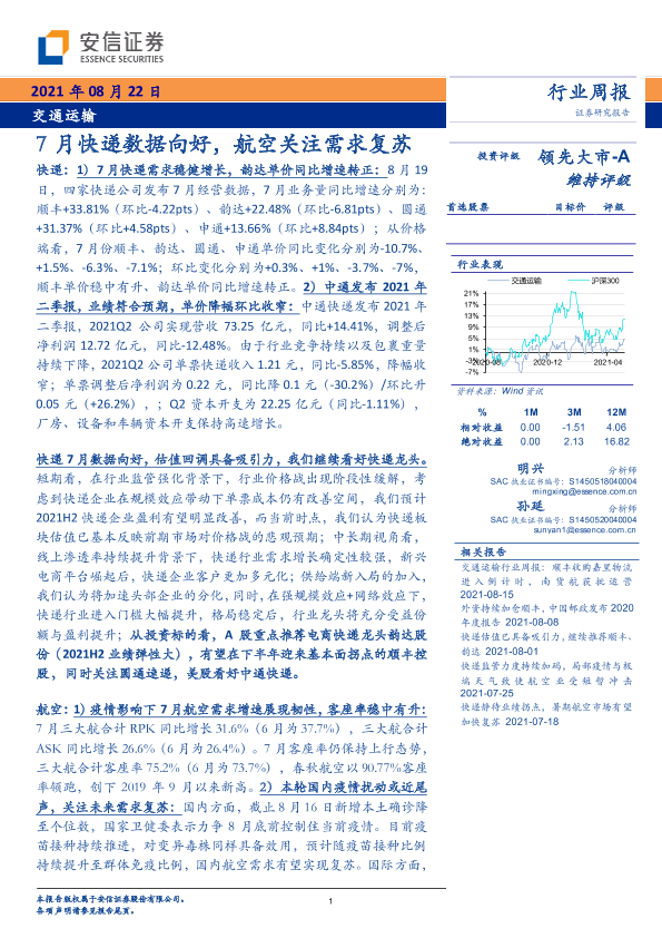 【安信证券】【20210822】7月快递数据向好,航空关注需求复苏-18页