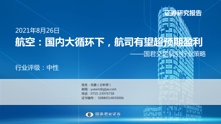 【国泰君安证券】【20210826】航空:国内大循环下,航司有望超预期盈利-22页