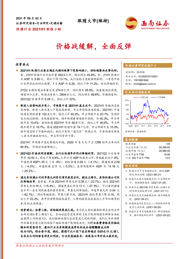 【西南证券】【20210903】快递行业2021H1财报小结:价格战缓解,全面反弹-13页