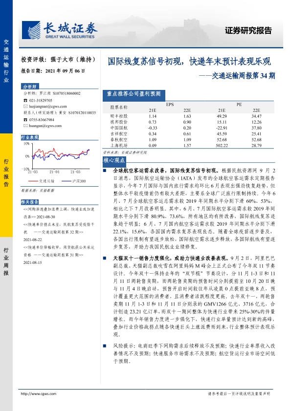 【长城证券】【20210906】国际线复苏信号初现,快递年末预计表现乐观-25页