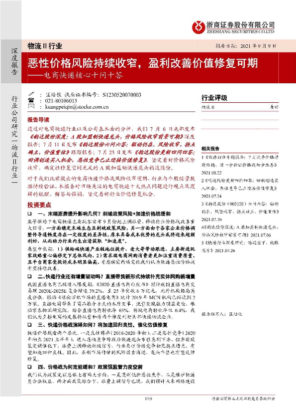 【浙商证券】【20210909】电商快递核心十问十答:恶性价格风险持续收窄,盈利改善价值修复可期-19页