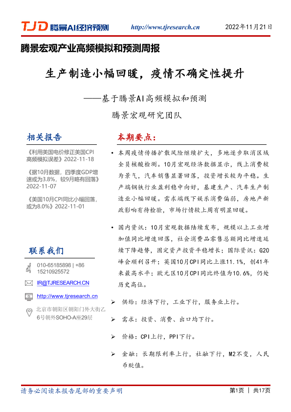 【腾景AI】【20221121】宏观周报:生产制造小幅回暖,疫情不确定性提升-17页