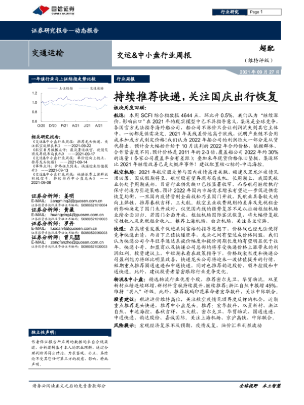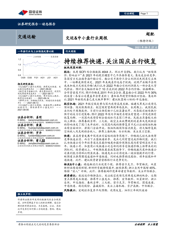 【国信证券】【20210927】交运&中小盘行业周报:持续推荐快递,关注国庆出行恢复-19页