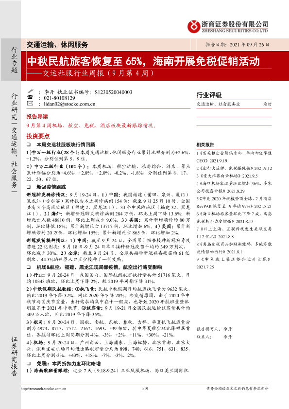 【浙商证券】【20210926】交运社服行业周报:中秋民航旅客恢复至65%,海南开展免税促销活动-19页