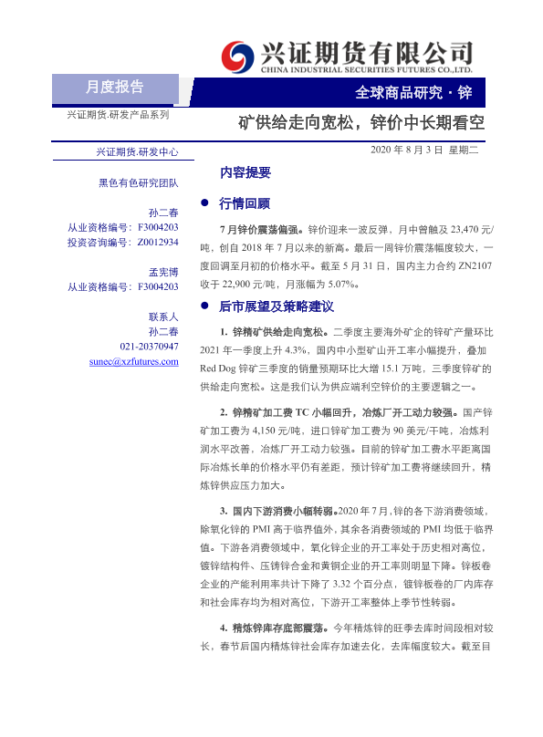 【兴证期货】【20210803】锌月度报告:矿供给走向宽松,锌价中长期看空-17页