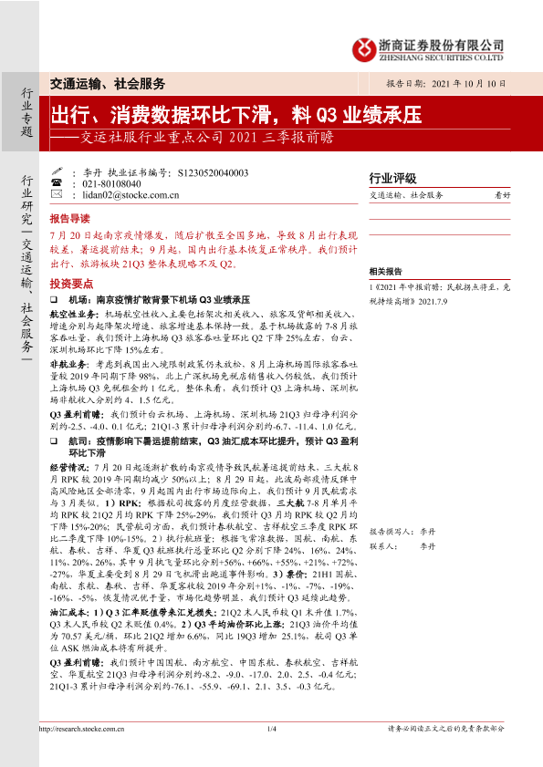 【浙商证券】【20211010】交运社服行业重点公司2021三季报前瞻:出行、消费数据环比下滑,料Q3业绩承压-4页