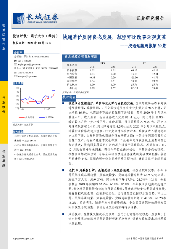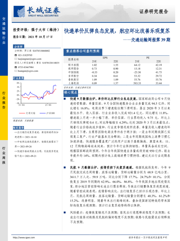 【长城证券】【20211017】快递单价反弹良态发展,航空环比改善乐观复苏-24页