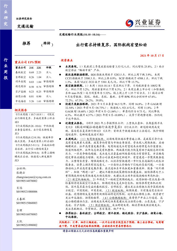 【兴业证券】【20211017】交通运输行业周报:出行需求持续复苏,国际航线有望松动-25页