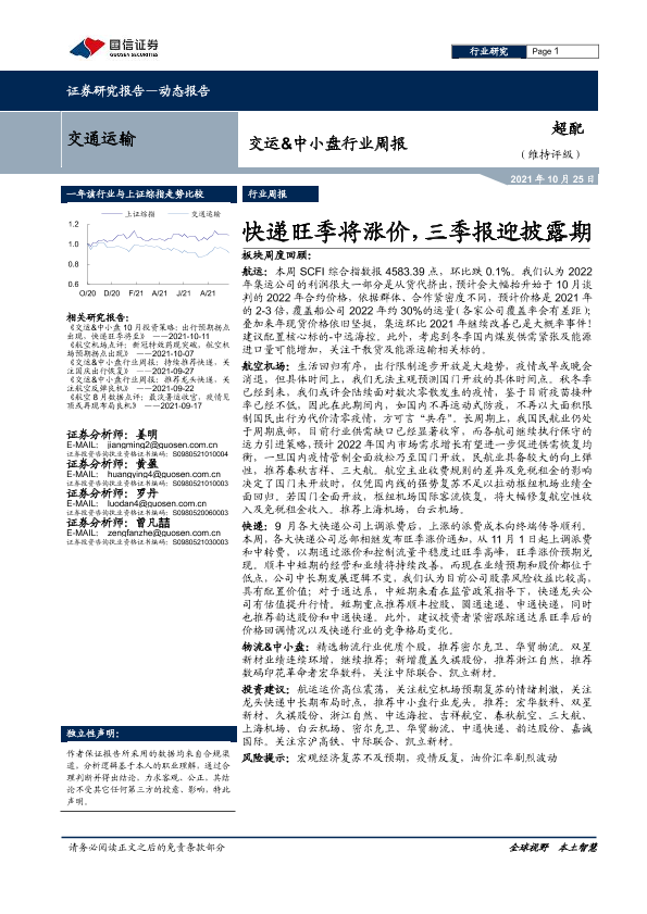 【国信证券】【20211025】交运&中小盘行业周报:快递旺季将涨价,三季报迎披露期-25页