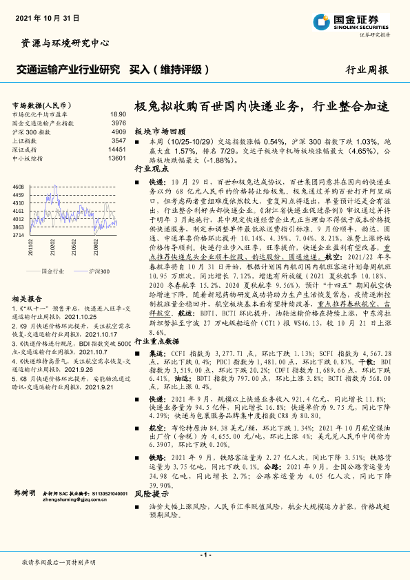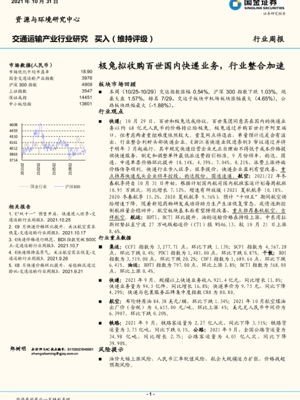 【国金证券】【20211031】交通运输产业行业研究周报:极兔拟收购百世国内快递业务,行业整合加速-14页