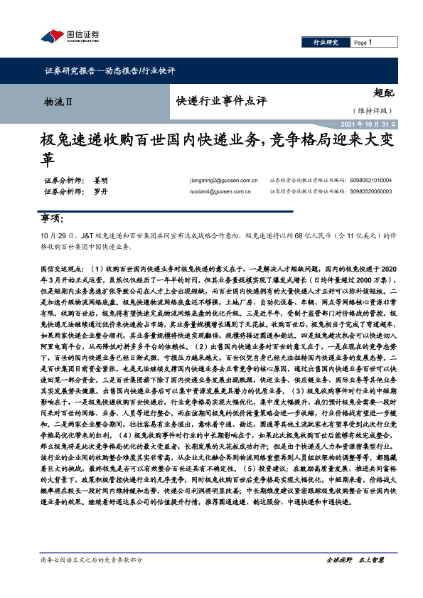 【国信证券】【20211031】快递行业事件点评:极兔速递收购百世国内快递业务,竞争格局迎来大变革-7页