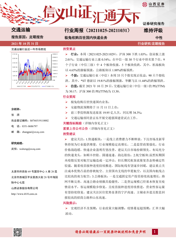 【山西证券】【20211031】交通运输行业周报:极兔收购百世国内快递业务-16页