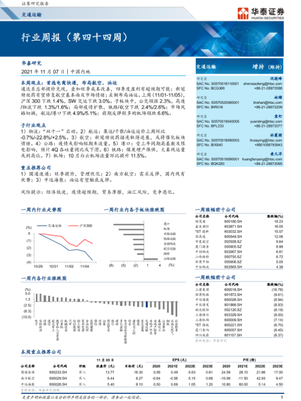 【华泰证券】【20211107】交通运输行业周报(第四十四周)-10页