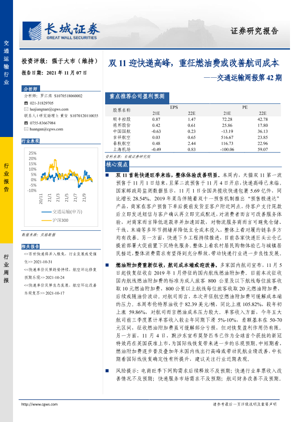 【长城证券】【20211107】双11迎快递高峰,重征燃油费或改善航司成本-27页
