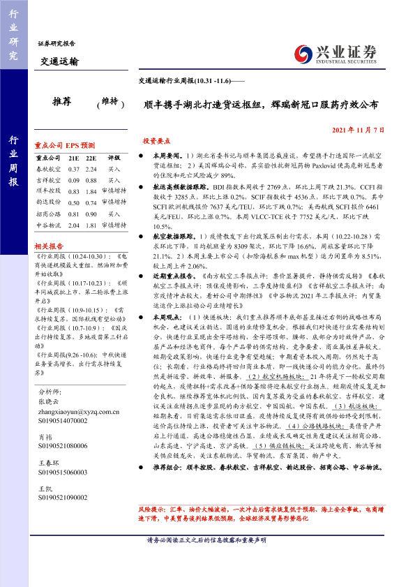 【兴业证券】【20211107】交通运输行业周报:顺丰携手湖北打造货运枢纽,辉瑞新冠口服药疗效公布-20页