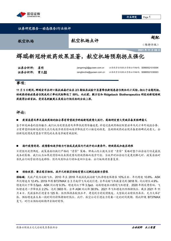 【国信证券】【20211108】航空机场点评:辉瑞新冠特效药效果显著,航空机场预期拐点强化-9页