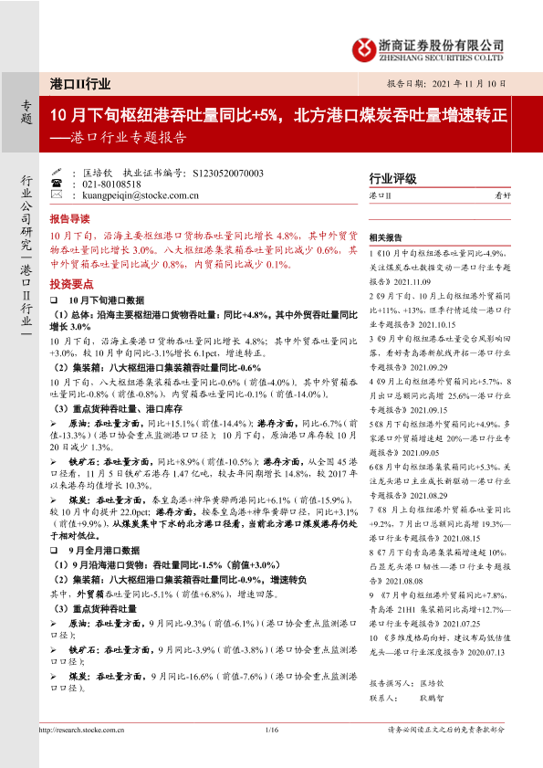 【浙商证券】【20211110】10月下旬枢纽港吞吐量同比+5%,北方港口煤炭吞吐量增速转正-16页