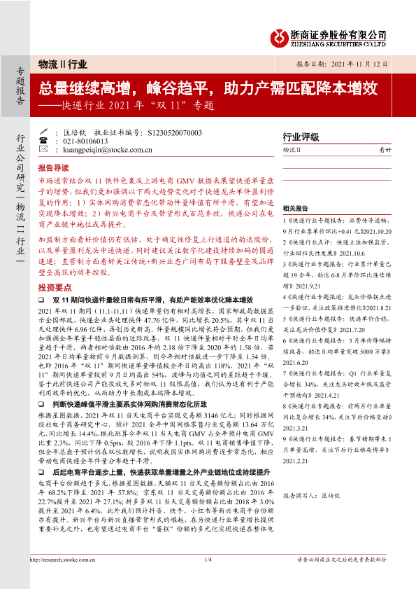 【浙商证券】【20211112】快递行业2021年“双11”专题:总量继续高增,峰谷趋平,助力产需匹配降本增效-4页