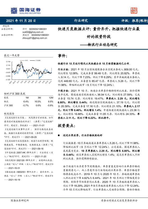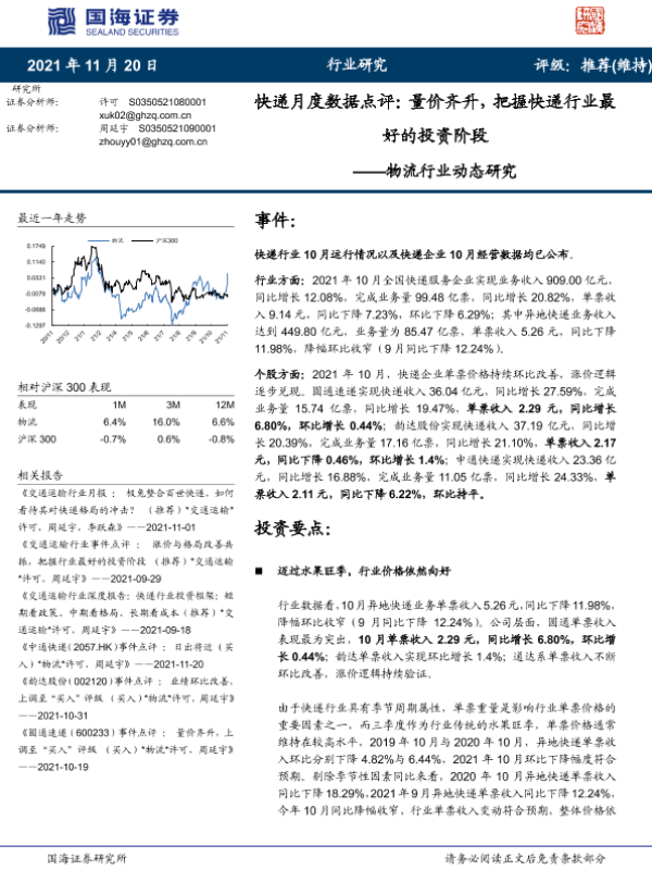 【国海证券】【20211120】快递月度数据点评:量价齐升,把握快递行业最好的投资阶段-5页